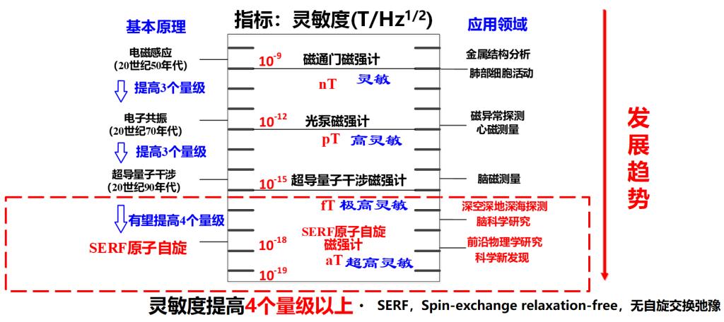 在极弱磁测量领域,极限指标的突破不断扩展人类对世界的认识。最初的磁通门磁强计,灵敏度为nT量级,即10-9特斯拉;光泵磁强计可达到pT量级,即10-12特斯拉;超导量子干涉磁强计可以达到fT量级,10-15特斯拉。而SERF原子自旋磁强计,灵敏度可再提高4个量级以上,进入阿特量级。这为人类认识世界提供了一种新工具,将引领极弱磁测量技术变革,带来新的科学发现和应用价值!