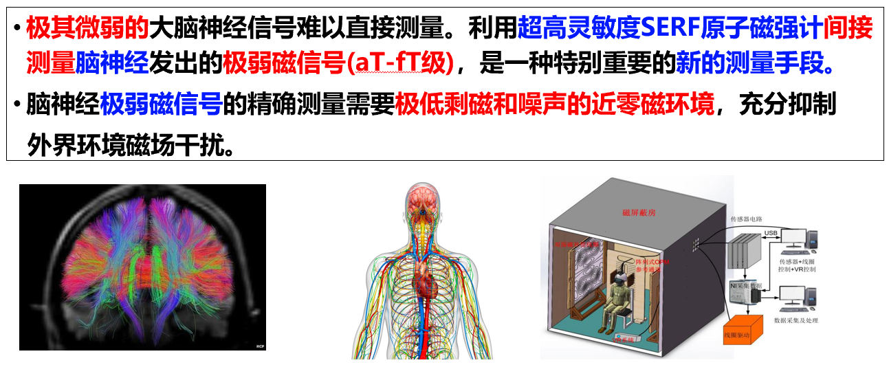 极弱磁成像,例如脑磁成像的优势是能够在高空间分辨率下反应大脑活动毫秒量级上变化的动态过程。利用这些信息可以精确还原大脑加工信息的整体过程,并观察信号如何随时间变化的。另外,由于低频神经磁场没有受到头骨严重干扰,因此可以准确地定位大脑特定区域的活动情况。通过配准与核磁共振大脑解剖结构图像相结合,成像技术得到在大脑在特定区域内的神经活动激活模式,从而帮助人类了解大脑的功能和疾病的介观机制。基于原子自旋SERF效应的极弱磁测量可以使空间分辨率和磁源定位精度进一步提高,达到毫米级的空间分辨率,从而为脑科学研究、脑疾病诊断研究提供有力的工具。基于原子自旋SERF效应的脑磁测量将会更快更准地检测到人体磁场,从而追踪其来源,可以确定大脑的哪些部位用于不同的心理认知过程或出现神经异常电活动。还可以确定大脑功能区之间的交互过程,从而可以构建大脑中的有向复杂网络。